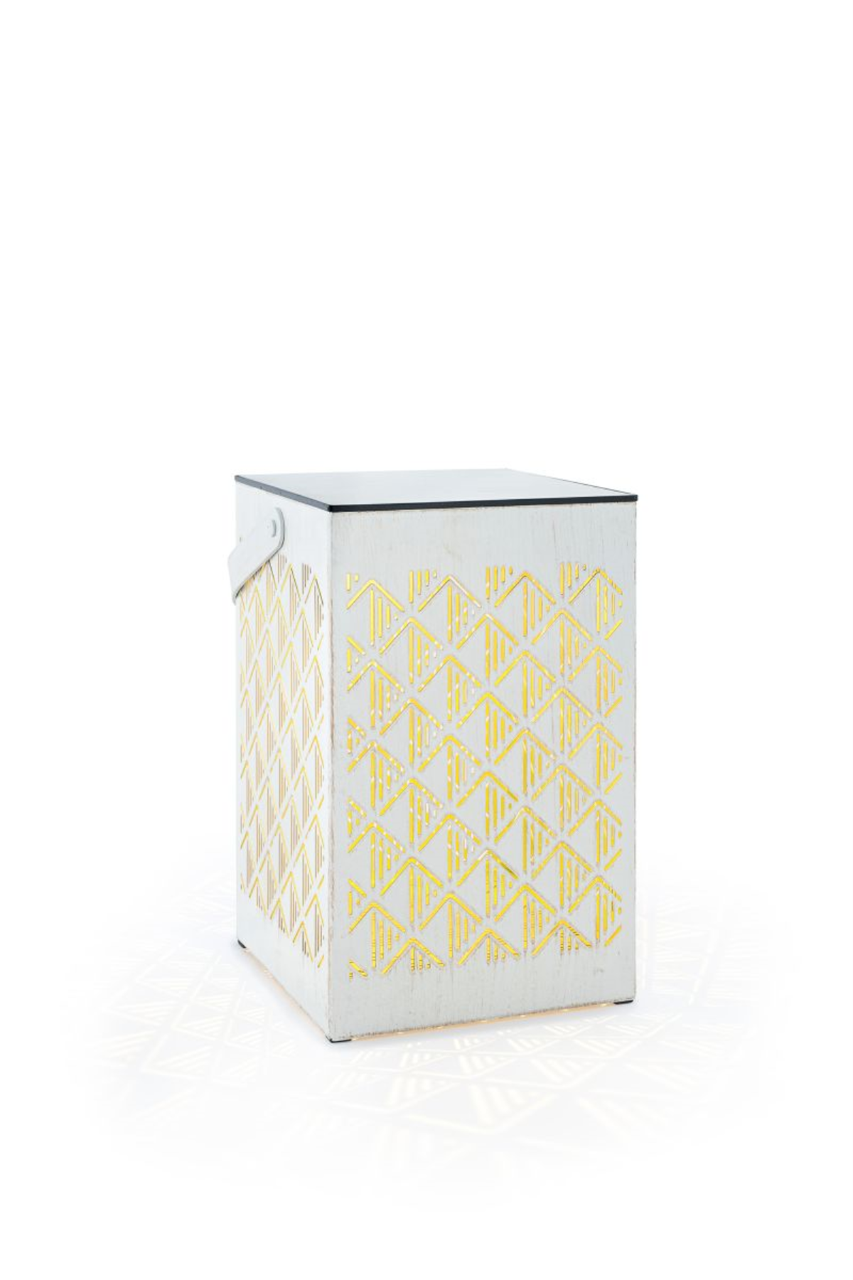 3D-Akku-Laterne Struktur | Metall Weiß/Gold | Akku 2000mAh | wiederaufladbar mit USB | HxBxL: 24,5x15x15cm | 1 LED | warmweiß | IP44 | Timer: 6h an, 18h aus |