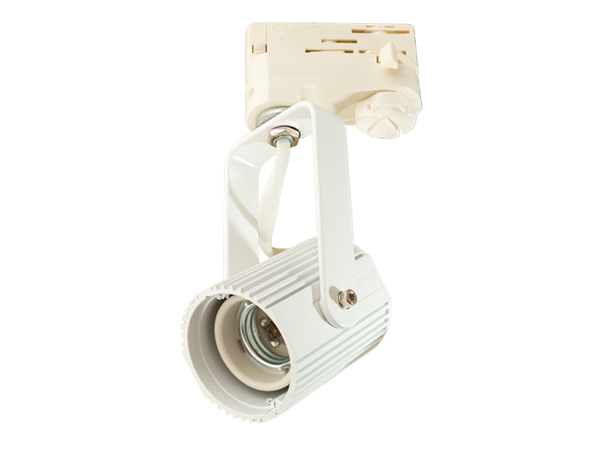 3Phasen-Stromschienenstrahler E27 | Gehäuse: weiß | Drehbereich: 350° | Schwenkbereich: 180° | D: 57mm | H:195mm |
