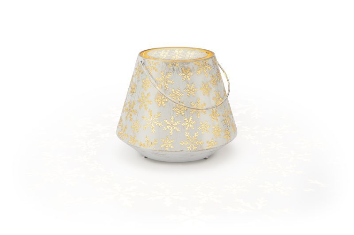 Akkubetriebene Metall-Laterne Flake 23 | weiß-gold | HxD: 23x26cm | warmweiß | IP44 | inkl. Timer: 6h on/18h off | Batterie: 2x4000mAh AKKU ICR 18650 inkl. | USB-C |