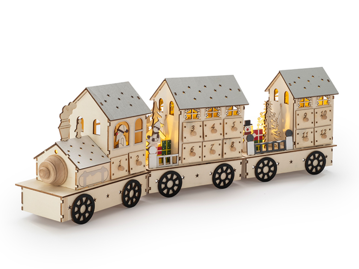 Batteriebetriebener Adventskalender "Weihnachtszug" weiß | LxHxB: 55x17,2x9cm | 8 LEDs | warmweiß | IP20 | Batterie: 2xAAA exkl. | Timerfunktion: 6h an, 18h aus |