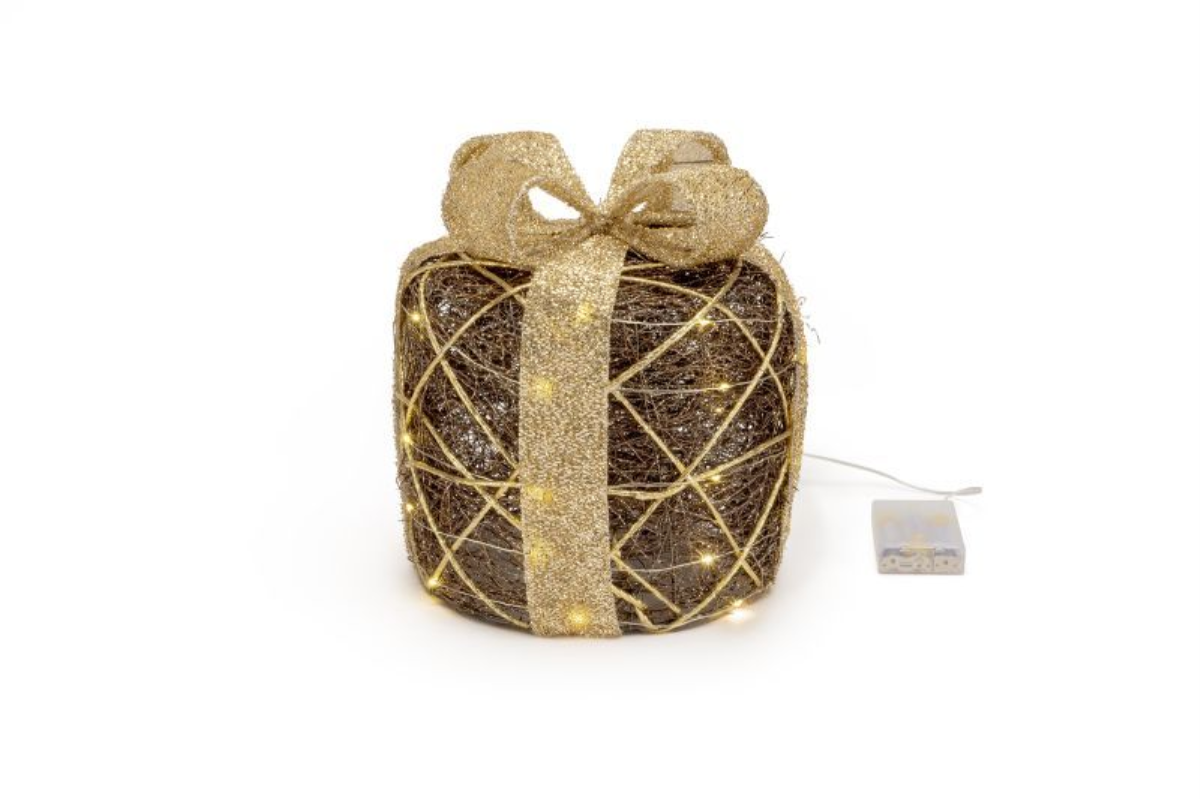 Batteriebetriebenes Rattan-Geschenkspaket | braun/gold | HxB: 30x25cm | warmweiß | IP20 | inkl. Timer: 6h on/18h off | Batterie: 3xAA exkl. |