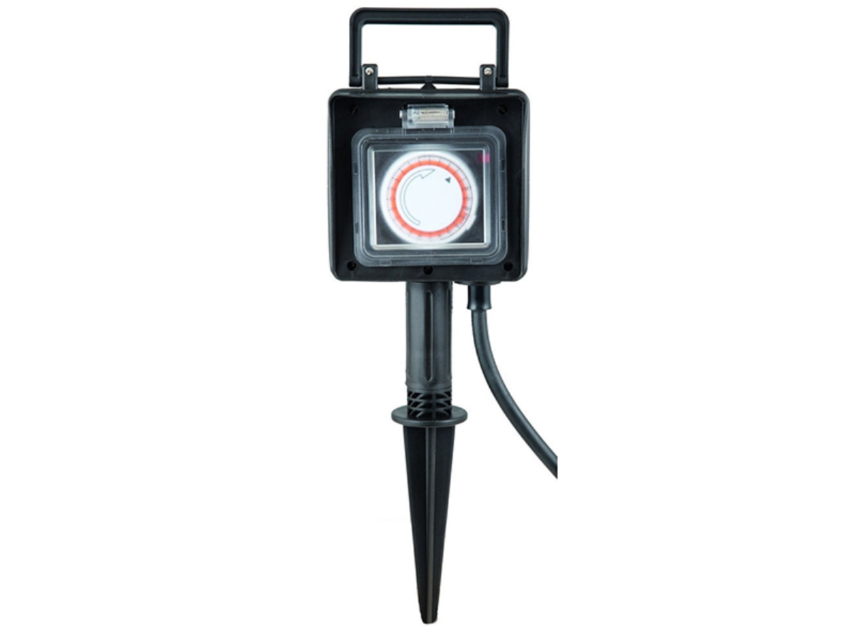 Gartensteckdose mit Erdspieß | inkl. Zeitschaltuhr | 2fach mit Klappdeckel | max. 3680W | H: 385mm (230mm über Boden) | B: 130mm | Zuleitung: 1,5m | IP44 |