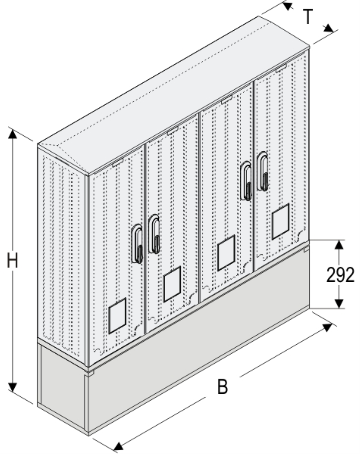 OSZ 26x4x80 + KP Kasten GFK mit Kurzsockel mit Trennwand, gerippt, Flachdach, 4-türig, 4 Sperren, BxHxT=1058x1089x245